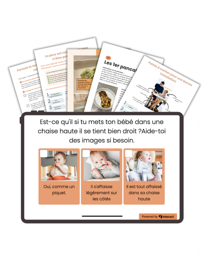 Un cours numérique, à suivre à votre rythme, et un guide étape par étape pour introduire les premiers morceaux et allergènes, en toute sécurité pour limiter les risques d’étouffement.