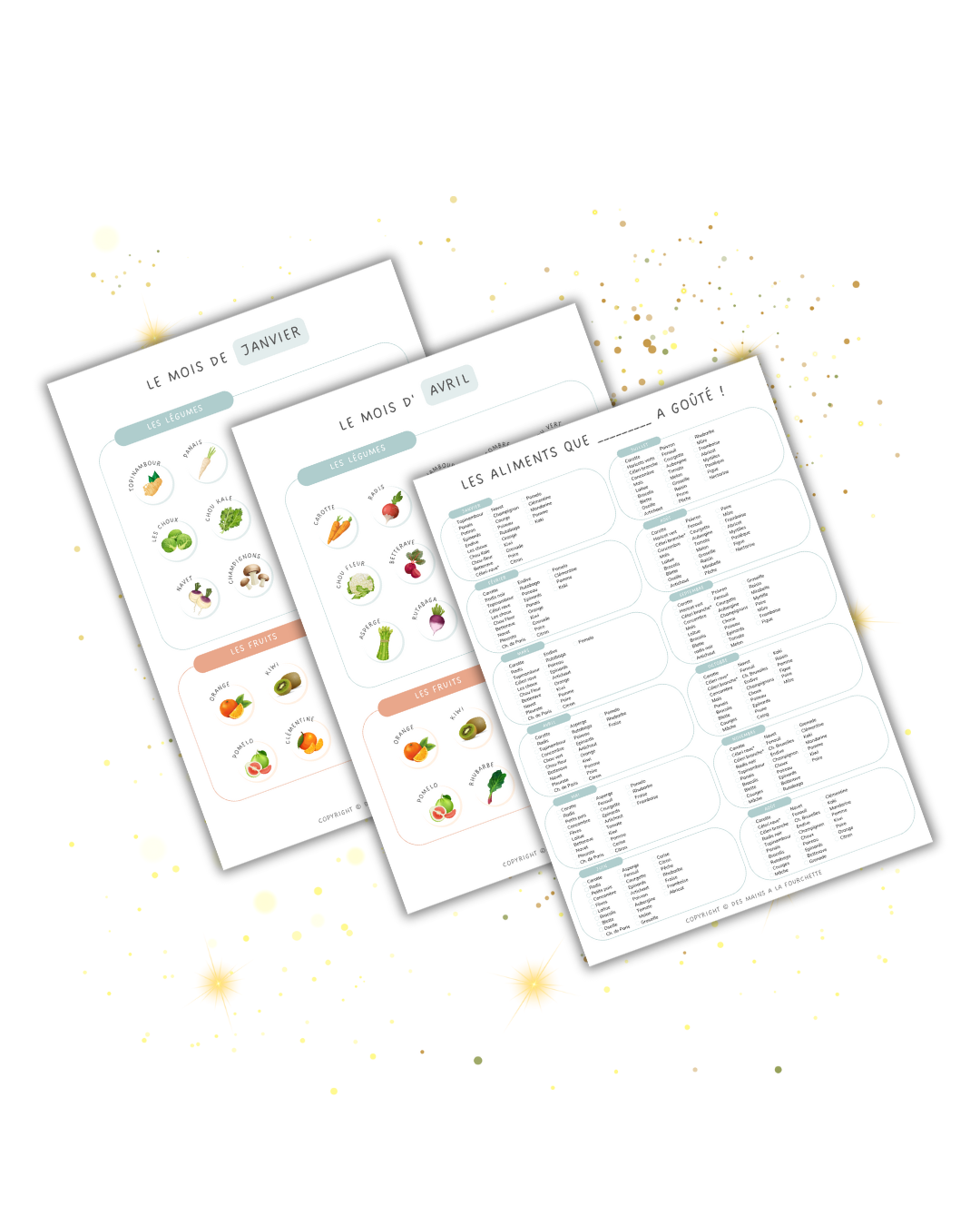 Vous y trouverez les fruits et légumes pour chaque mois de l’année, ainsi qu’une petite fiche pour cocher les aliments que bébé a déjà goûtés.