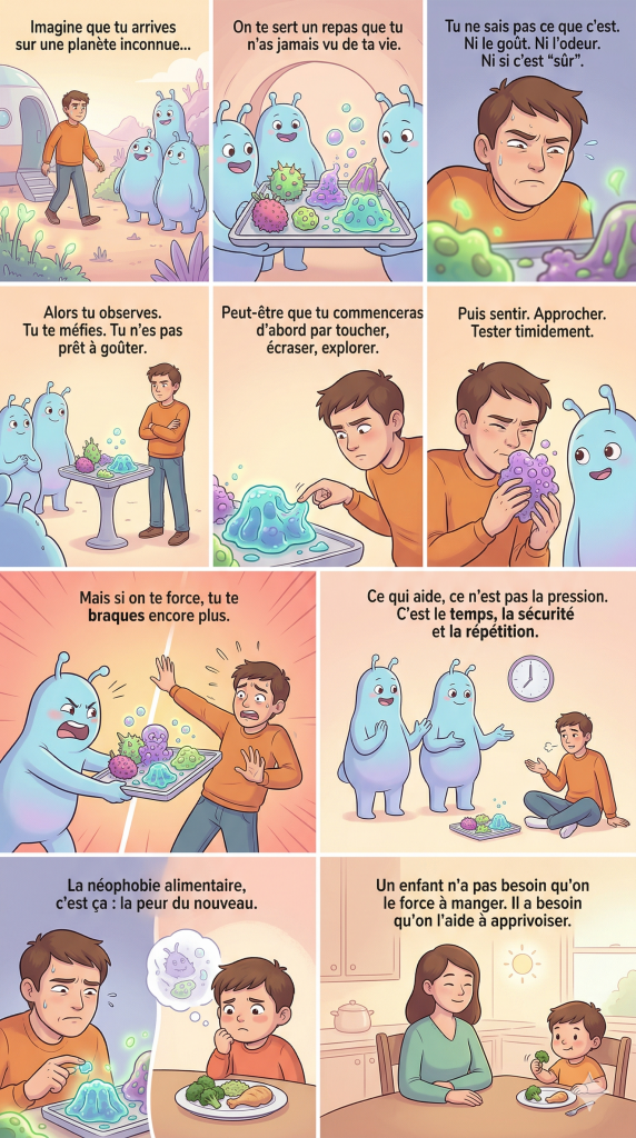 Pour vraiment comprendre ce que vit ton enfant, imagine que tu débarques sur une planète inconnue. Des aliens très gentils te servent un repas de bienvenue. Mais tu ne reconnais rien : ni la couleur, ni l’odeur, ni la texture des aliments dans ton assiette.